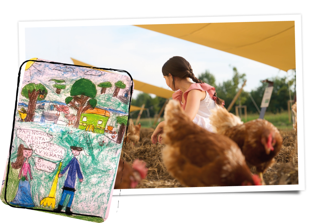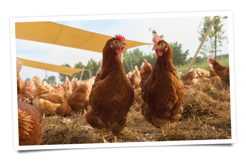 L’ambiente esterno è dotato di ampi pascoli e zone d’ombra dove le galline possono razzolare liberamente all’aria fresca e alla luce naturale, e “lavarsi” nei bagni di sabbia.