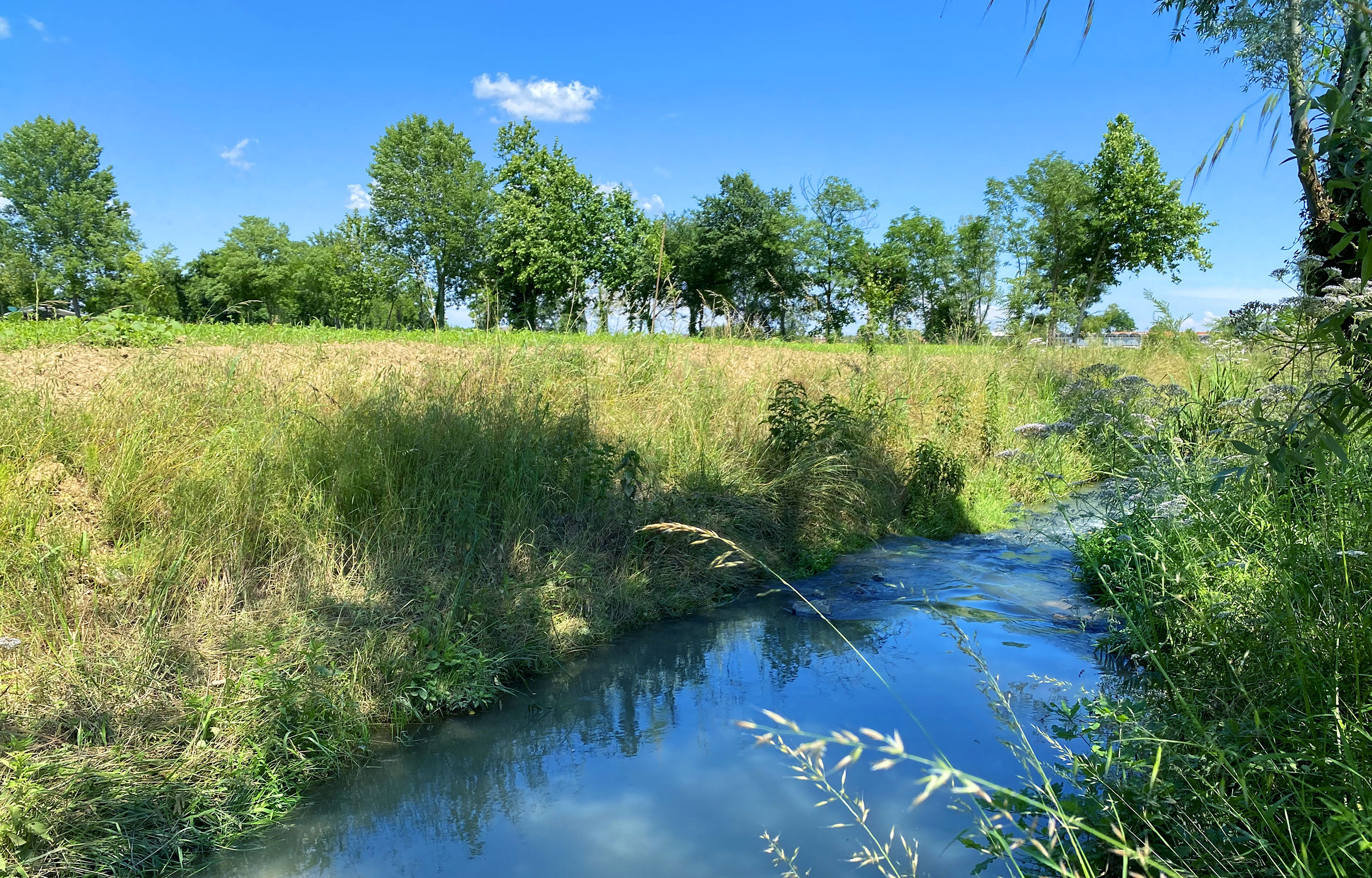 La riqualificazione del fossato aziendale prevede l’allargamento dell’alveo per una lunghezza di 240 metri lineari e la piantumazione di vegetazione spondale e acquatica di provenienza locale; la risorgiva garantirà una portata continua del flusso dell’acqua durante l’intero anno, con un costante movimento d’acqua.